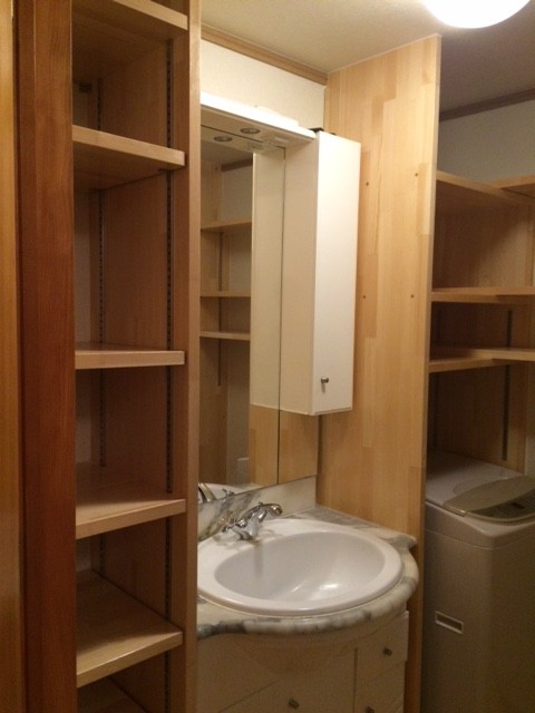 洗面室に棚を作り付け。 シックな洗面室が完成しました。