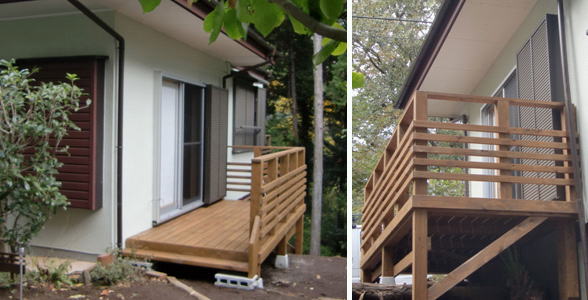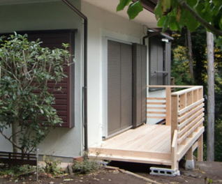 また出入り口となるサッシが腰高だったので掃出窓に入れ替えました。面する部屋が和室でしたので建具(障子)の入れ替えと周辺の木の造作も同時に行っています。 美しいジャパニーズウッドデッキが完成しました。
